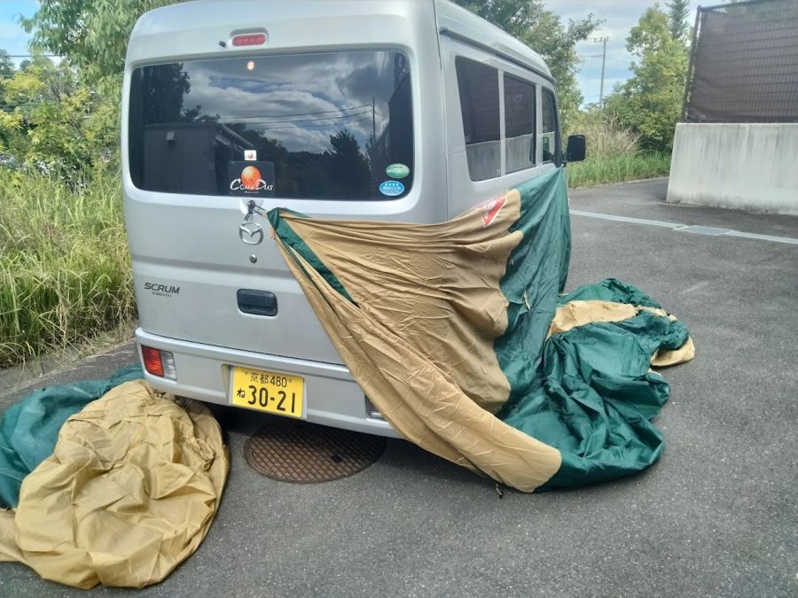 『突然ですがキャンプ行きません?』と連絡があった。 こりゃ準備せな笑 いつぶり? 2014年4月に家族で行ったキャンプ以来やん。 早速テントを袋から出して状態のチェック。 とりあえず広げて天日干ししてみた。 立てれるか?笑 久しぶりやし頑張って立てる手順を覚えよう。