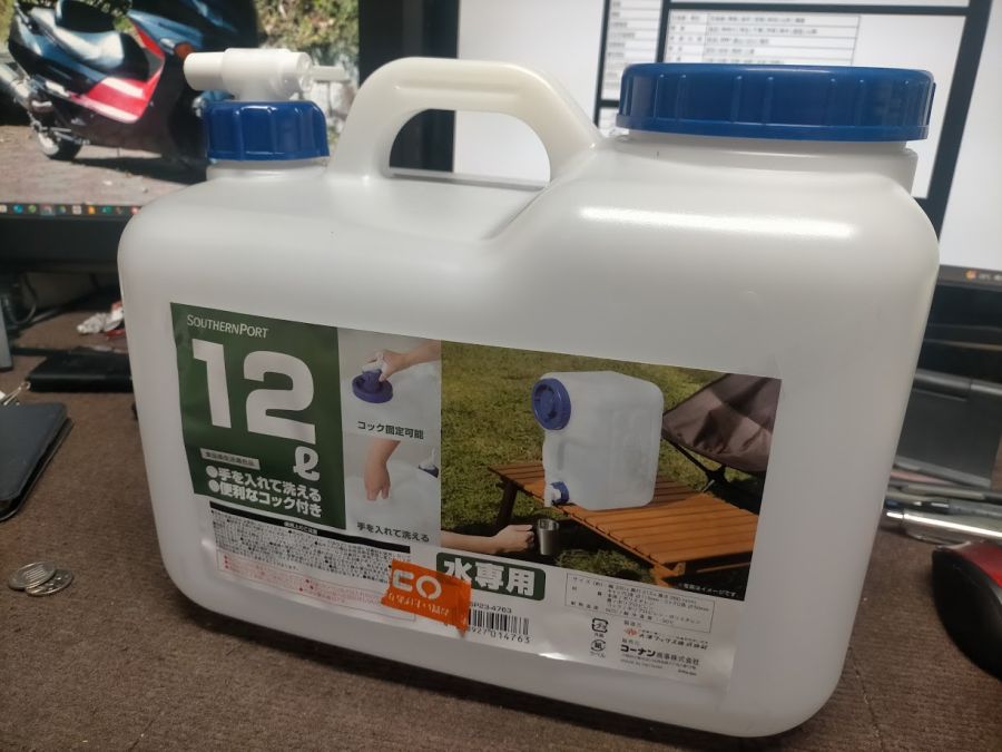 キャンプの時に使っていた水タンク。 今は店の手洗いなどで使っている。 紫外線でやられて買い換えているが。 キャンプ用に12リットルのを購入。 877円^^