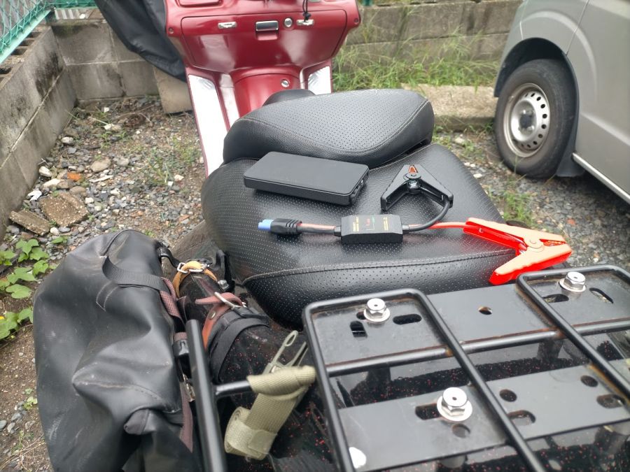 バッテリーもまた上がっていたので充電はしてあったので載せてみる。 カチカチって感じやったのでジャンプスターターでかけた。 エンジンは無事にかかる。 さぁあとは部品が届いたら交換や。 もうここでしようかな。 また走って行くのもあれやし。 ただエンジンの回転を上げないとあかんのがね^^;;