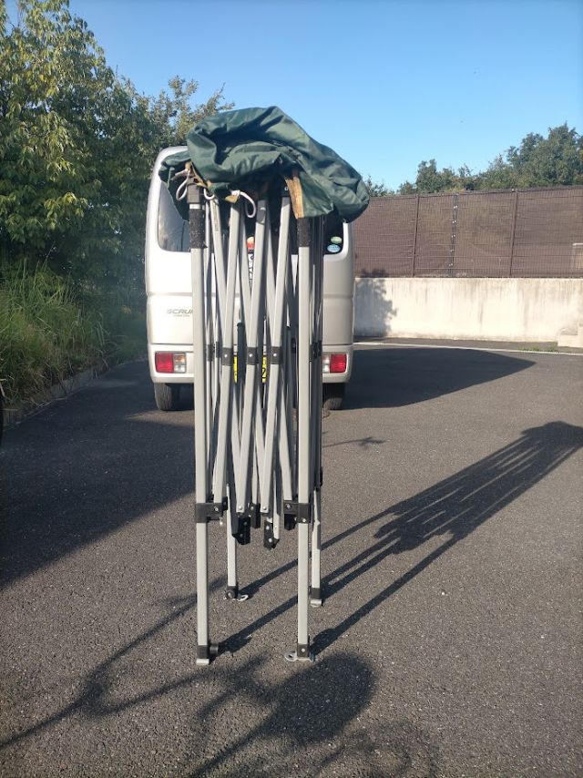 11月にまたHiroyuki Familyとキャンプへ行く予定なんやが その時は山岳テントとこれを張ろうかなと。 そのために天日干しと状態確認。 骨組みを出して広げる。 広げて四隅カチッと固定。 その上にシートはって足を延ばす。 これで完成^^ 楽やは〜