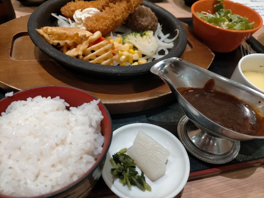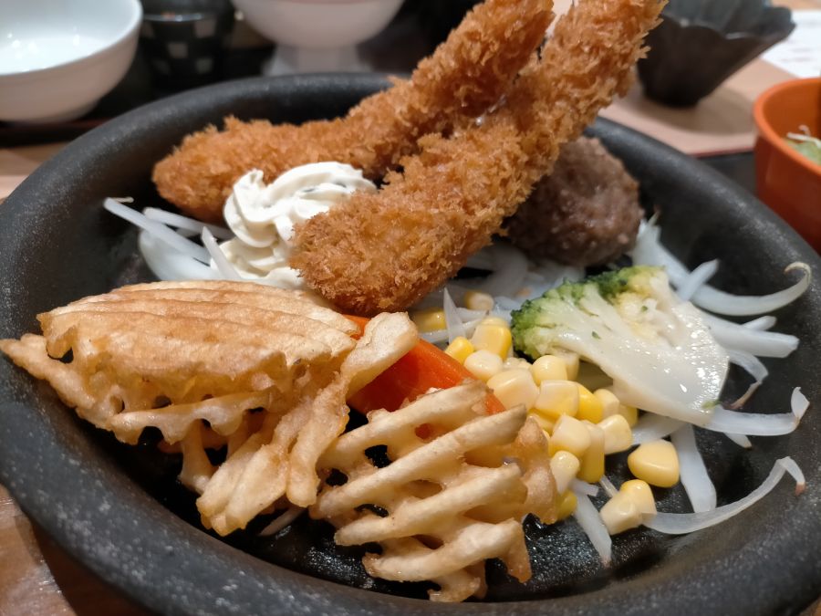 朝から何も食べてないので ハンバーグと海老フライ膳と唐揚げ単品も食べた。
