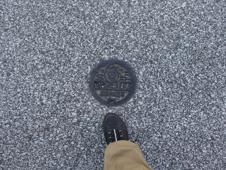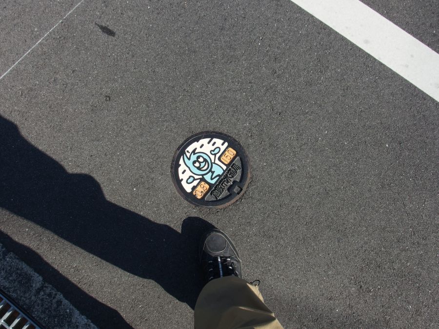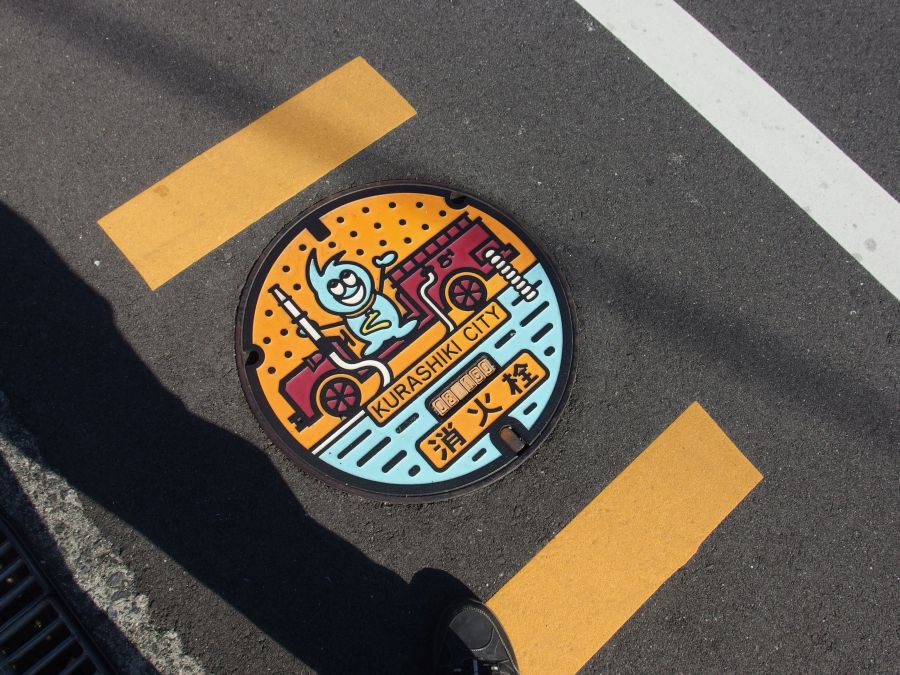 目的地に駐車場がないのでどこかに止めないといかん。 まぁまぁコインパーキングが満。 そして何とか止めれた。 ちょうどあと一台だけ空いてた^^ 歩いて向かいます。 その時に発見したマンホール。 倉敷市水道局のイメージキャラクター『くらっぴぃ』が消防車に 乗っているデザイン^^