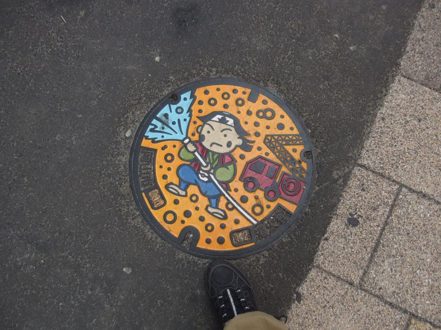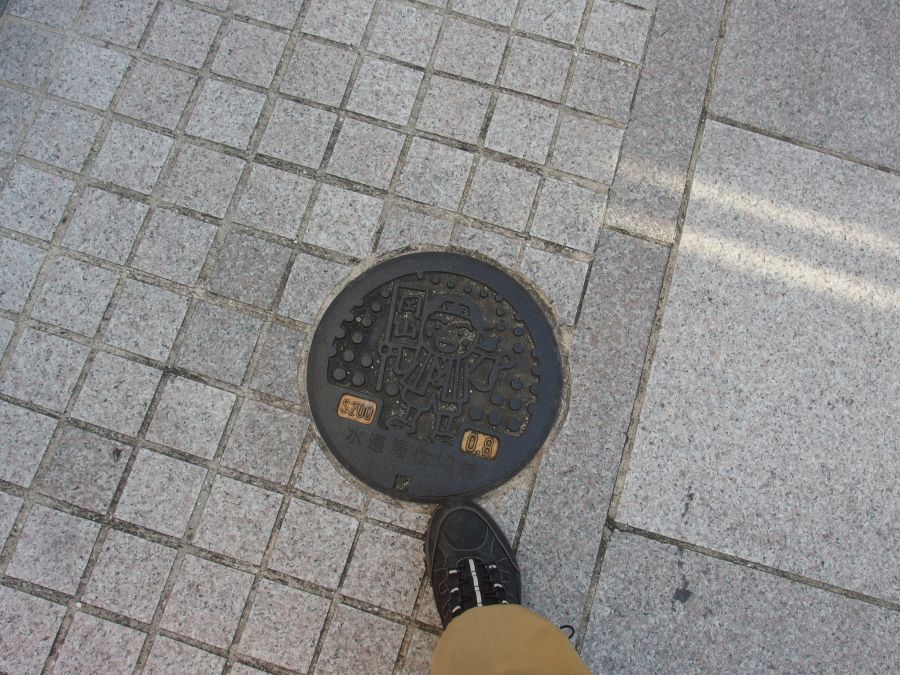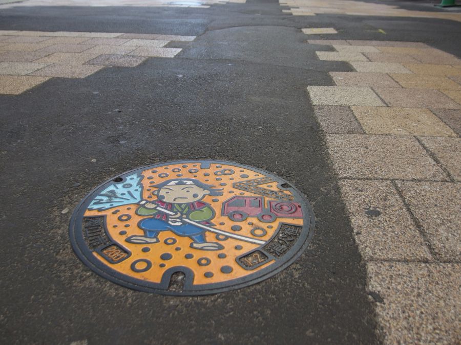 桃太郎伝説デザインの消火栓蓋。 桃太郎伝説の原型となった温羅伝説(うらでんせつ)に登場する鬼。 後で応援!?しているのがスイスイくんというらしい。 桃太郎伝説の消火栓蓋は6つあるみたい。