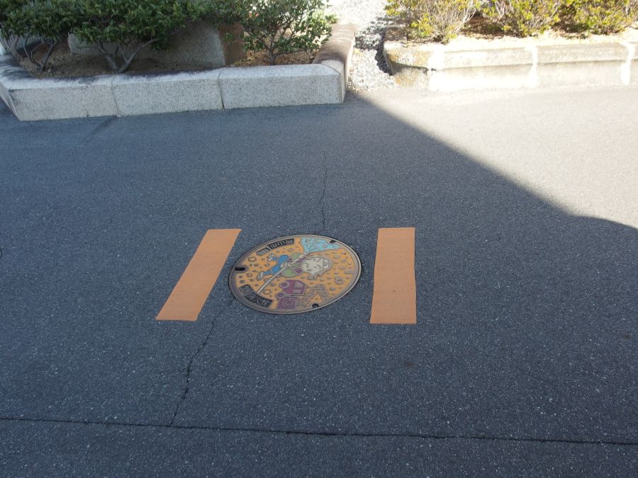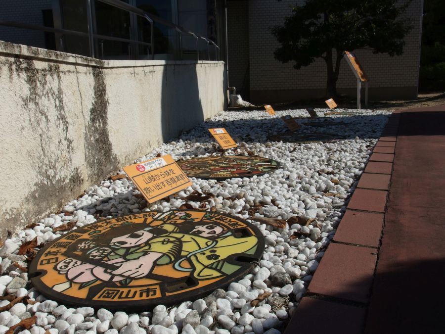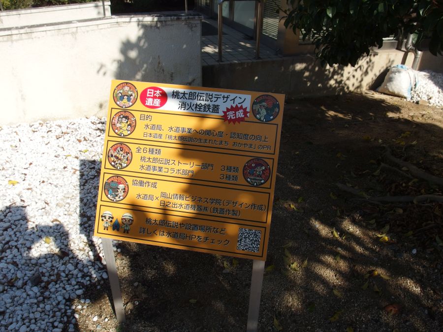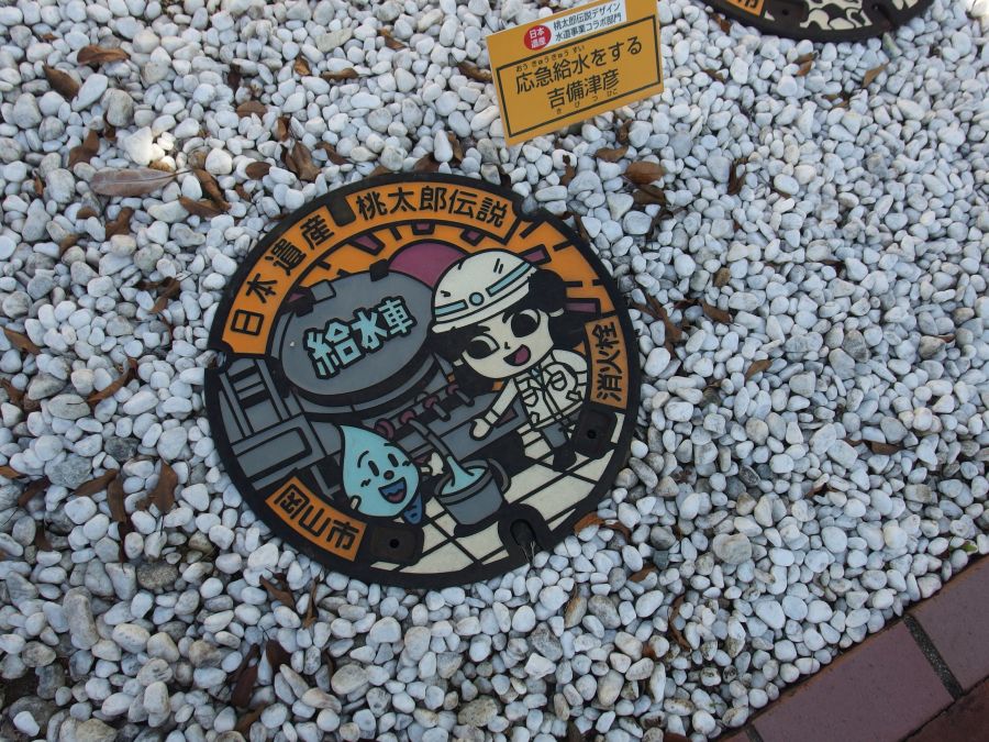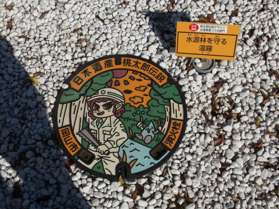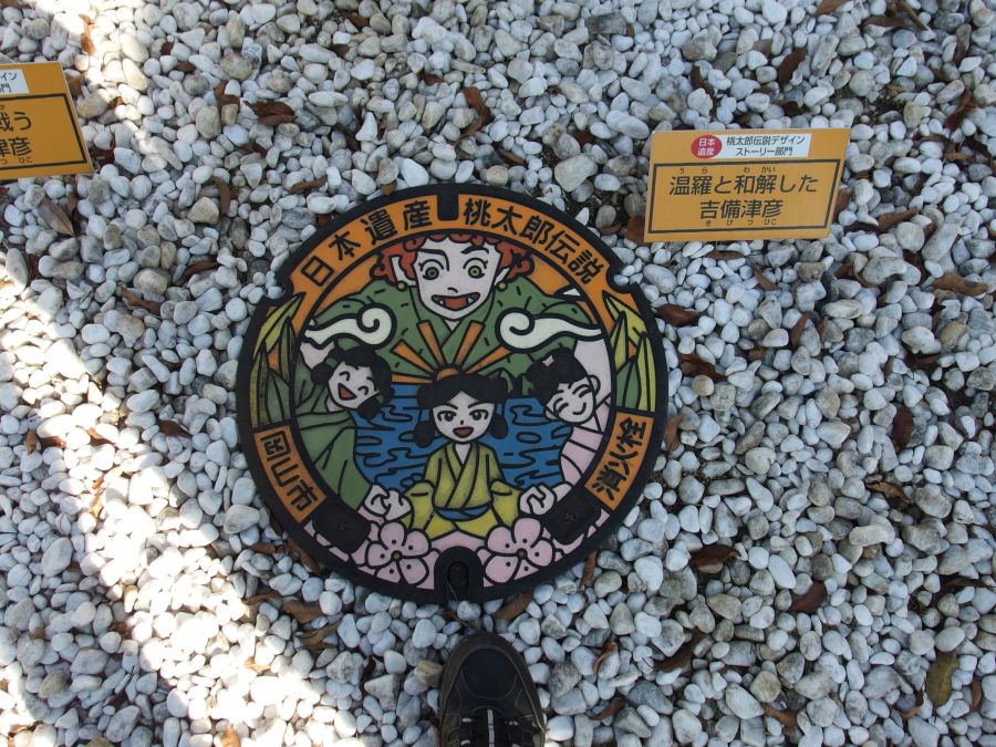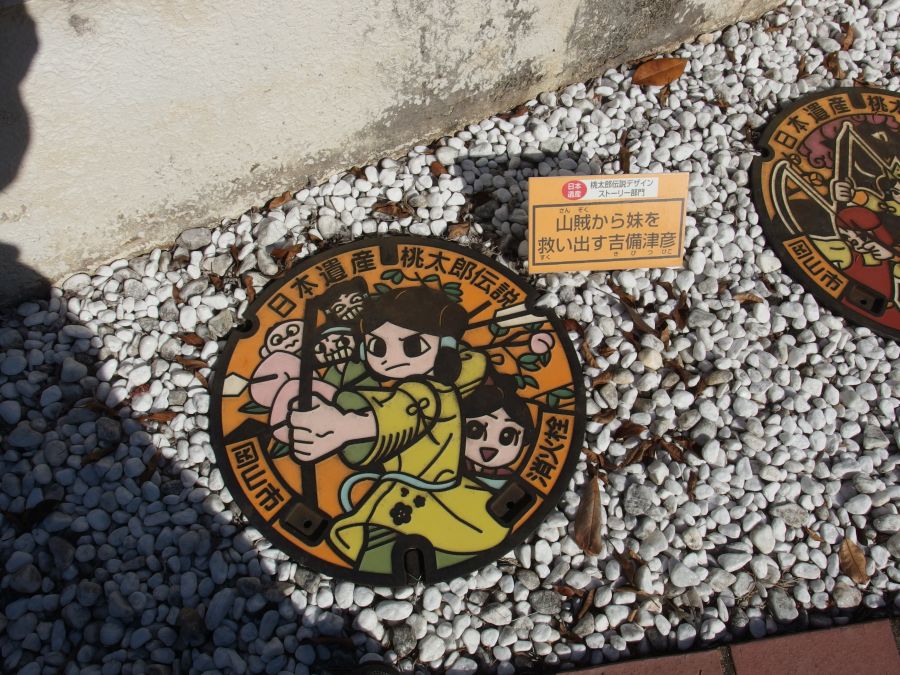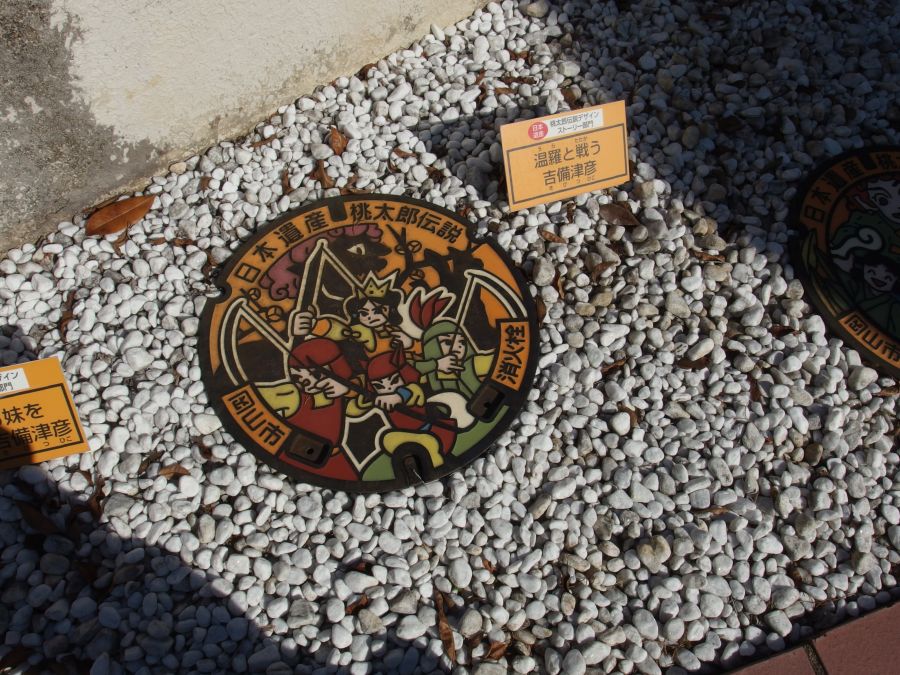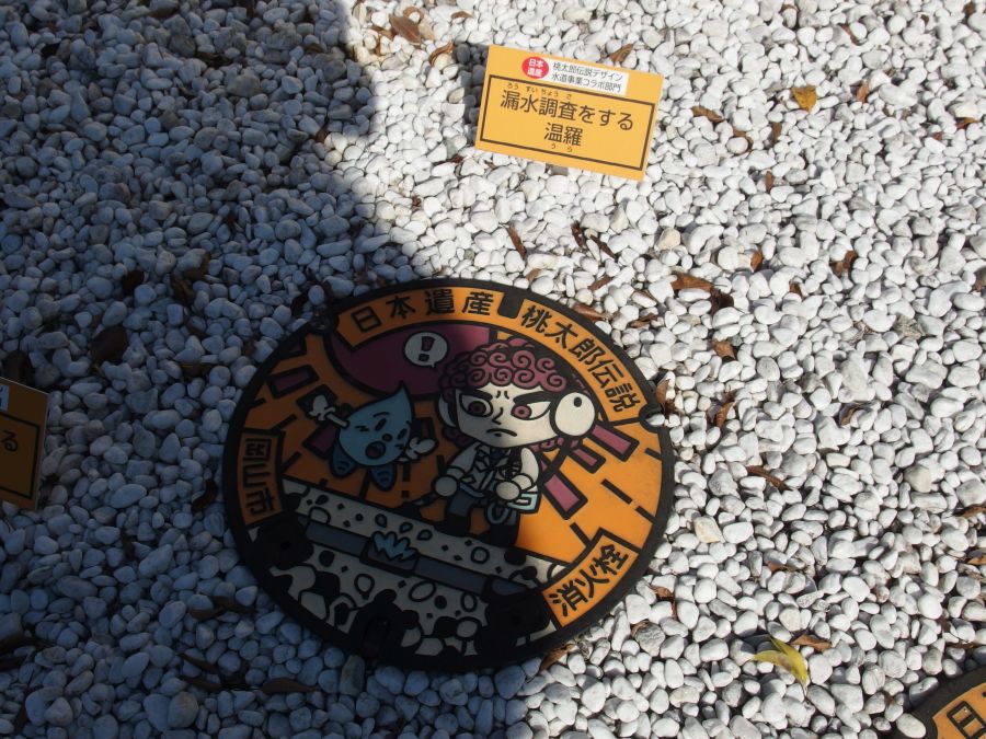 警備の子の詰所の裏にあった笑 桃太郎伝説デザイン消火栓蓋 全6種類! 6つもあったんか!